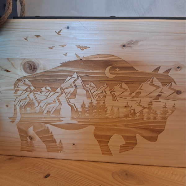 Gravure motif Bison et paysage.